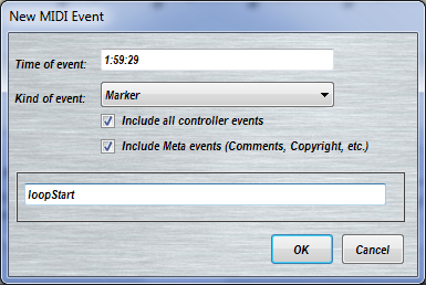 1.2. Know your songWe have a MIDI file of an own composition – let us call it “orig_test.mid”. It is a song with sixty-four measures, a time signature of 4/4 and a tempo of ♩ = 128. We already know the loop starts in measure 17, but we do not know what to do with this information. Read on the next section.1.3. ProcedureFirst off, does the song have ‘bahps’ in it? To make them work, follow this tutorial byNow click the ‘Edit’ tab and choose “Insert MIDI Event...”: another modal window will appear. Make sure to tick the two checkboxes below the drop-down list. Now click said list and select “Marker”. Now comes the fun part. Using a calculator, we will be employing very simple math to locate the loop points. The formula: = ( 60 × M × m ) ÷ T